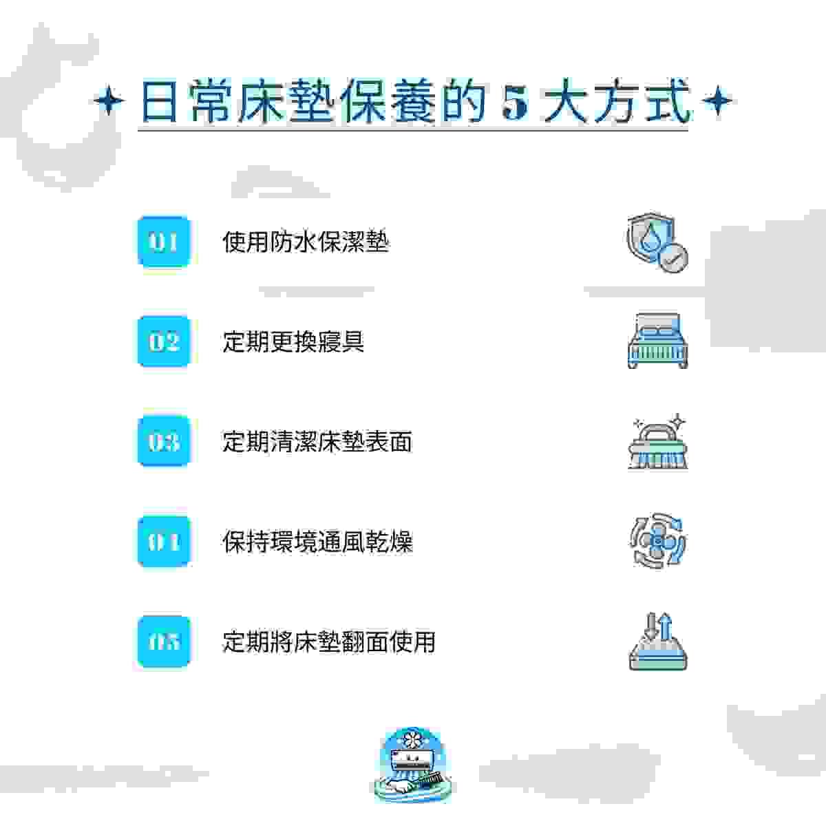 想要延長床墊壽命、保持良好睡眠品質,平時的日常保養不可少!平時可以藉由以下 5 種保養方式,來幫助你延長床墊壽命!